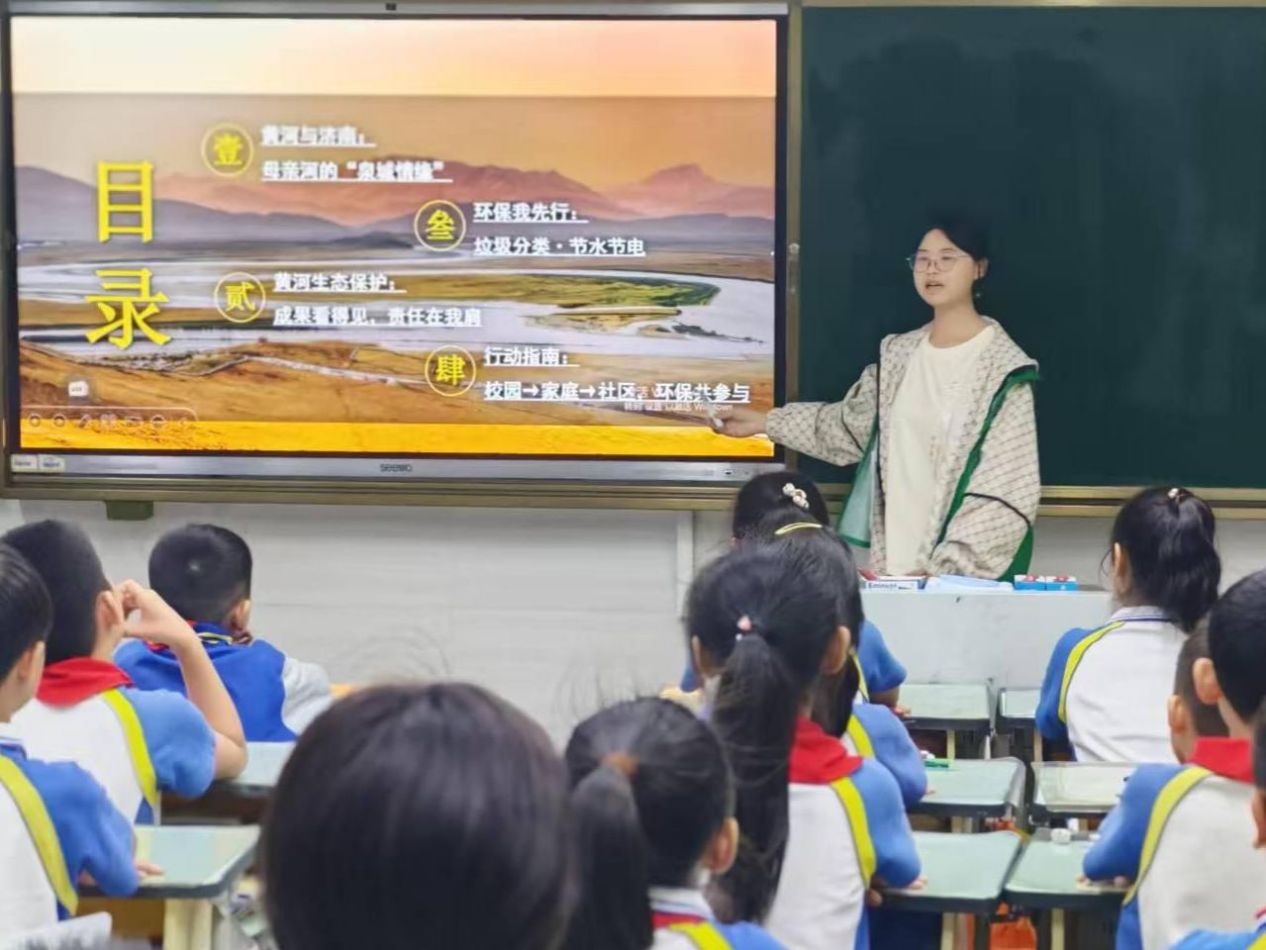 此次课程由宣讲团成员方雨晴主讲,围绕“黄河与济南”“黄河生态保护”“垃圾分类与节水节电”“家校社环保联动”四大板块展开,用学生易懂的语言和趣味案例,打破传统科普的枯燥感。在“黄河与济南:母亲河的泉城情缘”环节,方雨晴通过“地下水库”“水力联系”等形象比喻,结合趵突泉、黑虎泉等济南名泉实景,让同学们明白“黄河清则泉水旺”的道理——黄河流经济南时,清澈河水会渗透进地下岩层,为济南地下水“补给”,守护黄河就是守护家乡的泉水。现场的“快问快答”互动更点燃热情,“黄河是中国第二长河”“济南有趵突泉、五龙潭”等答案脱口而出,知识记忆愈发深刻。
